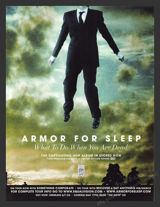 This 2005 print advertisement features the music album release by Armor For Sleep titled "What To Do When You Are Dead." The ad showcases a surreal image of a person in a suit seemingly floating or falling through a cloudy sky, capturing the ethereal and introspective theme of the album. This evocative imagery is indicative of the 2000s era, reflecting the band's unique style and the alternative rock scene of that decade.