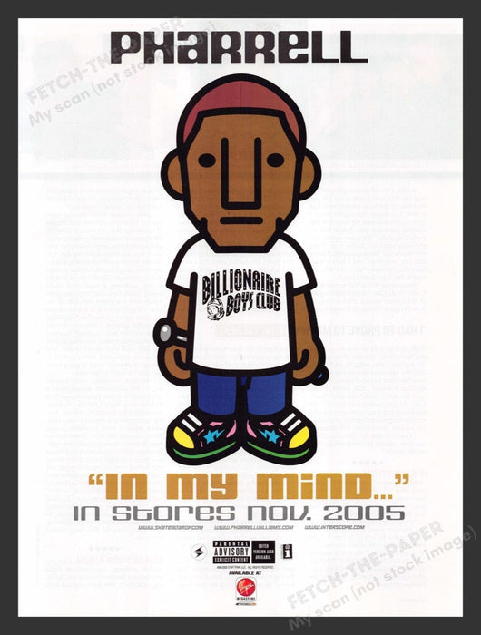 This magazine print ad from the 2000s promotes Pharrell's "In My Mind..." CD release in 2005. The advertisement features a stylized cartoon representation of Pharrell, wearing a Billionaire Boys Club t-shirt, colorful sneakers, and a watch, capturing the vibrant and unique style of the era.