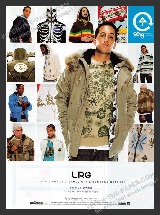 This 2007 LRG Clothing advertisement features DJ and musician Clinton Sparks, showcasing the brand's eclectic and vibrant fashion styles from the 2000s. The ad highlights various pieces of LRG apparel, including hoodies, jackets, and sweaters, each with unique designs and patterns that capture the essence of the decade's streetwear culture. The central image portrays Clinton Sparks in a stylish winter jacket layered over a graphic tee, epitomizing the brand's commitment to blending comfort with cutting-edge fashion.