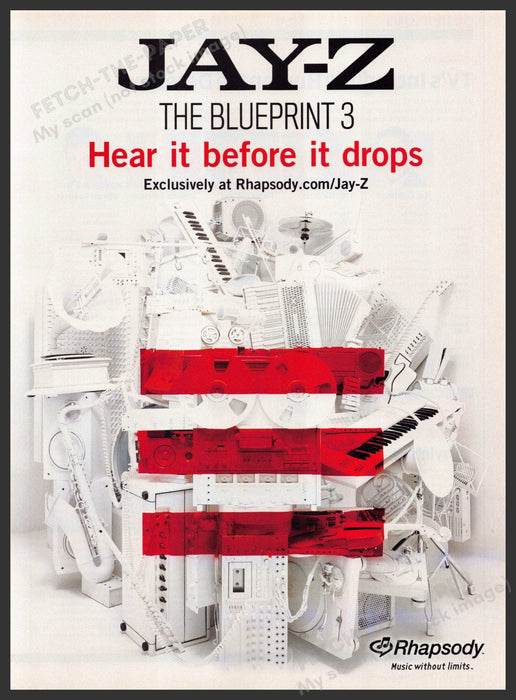 This 2009 magazine print ad features Jay-Z's album "The Blueprint 3" with a striking visual composition of white musical instruments and equipment, accented by bold red stripes. The advertisement promotes the exclusive opportunity to hear the album before its official release on Rhapsody.com. The design embodies the innovative spirit of the 2000s music scene.