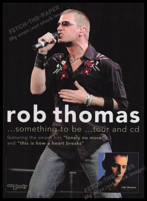 This 2005 print advertisement features Rob Thomas promoting his "Something to Be" tour and CD. Capturing the essence of the 2000s, the ad showcases Rob Thomas passionately performing on stage, highlighting his signature style and energy. The ad also mentions two of his hit singles, "Lonely No More" and "This Is How a Heart Breaks."