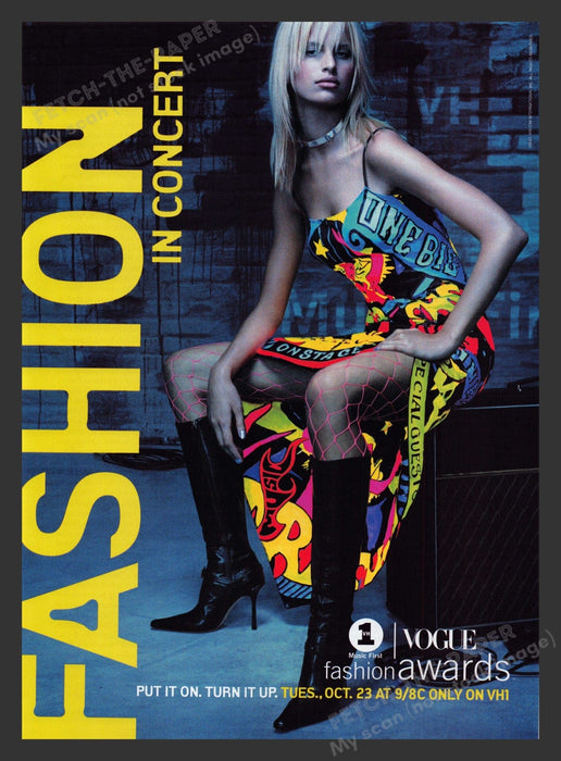This vintage print advertisement from the 2000s promotes the VH1 Vogue Fashion Awards. The ad features a stylish model in a vibrant, graffiti-inspired dress paired with fishnet stockings and high-heeled boots, embodying the edgy fashion trends of the early 2000s. The bold text "FASHION IN CONCERT" highlights the fusion of music and fashion, emphasizing the event's unique appeal.