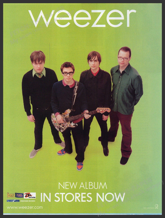 This vibrant 2001 Weezer advertisement showcases the band members standing against a bright green background, promoting their new album release. The ad captures the essence of early 2000s music culture with its bold colors and the band's distinctive style.
