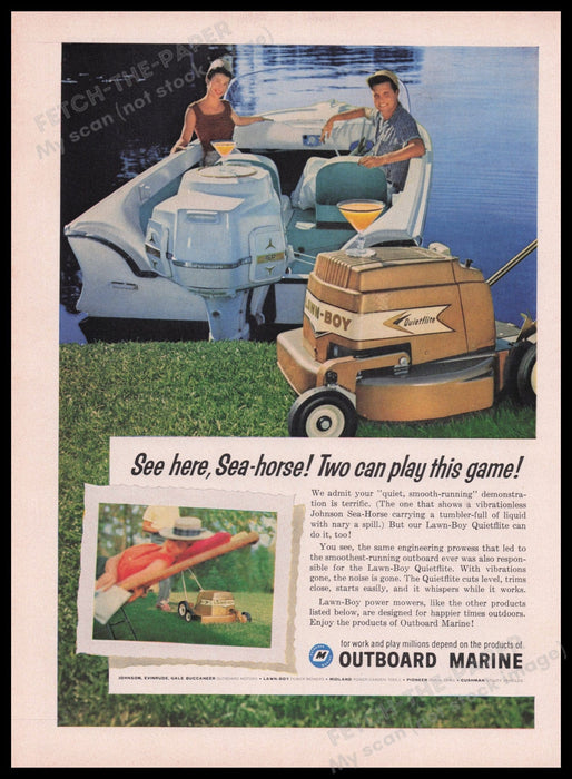This vintage 1959 Lawn-Boy Quietflite Lawnmower print advertisement captures the essence of the 1950s with a vibrant scene showcasing the lawnmower's smooth operation alongside a Johnson Sea-Horse outboard motor. The ad highlights the engineering prowess and quiet performance of the Lawn-Boy Quietflite, making it a standout product of its time.