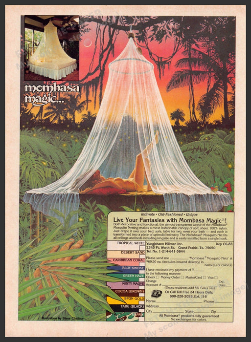 This vintage 1983 Mombasa print advertisement captures the essence of 1980s magic and fantasy. The ad features a woman lounging under a delicate mosquito netting canopy, with her legs elegantly extended, surrounded by a lush, tropical backdrop at sunset. The scene exudes an air of enchantment and intimacy, inviting viewers to transform their own spaces into exotic retreats with Mombasa Magic.