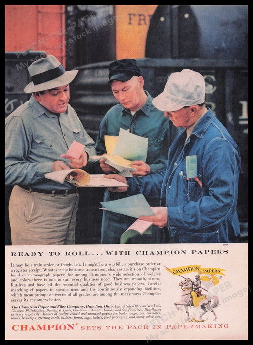 This 1950s Champion Papers advertisement showcases a group of men examining various types of paper, emphasizing the quality and versatility of Champion's products. The ad highlights the importance of Champion Papers in business transactions, from train orders to purchase receipts, underlining their smooth, strong, and lint-free characteristics.
