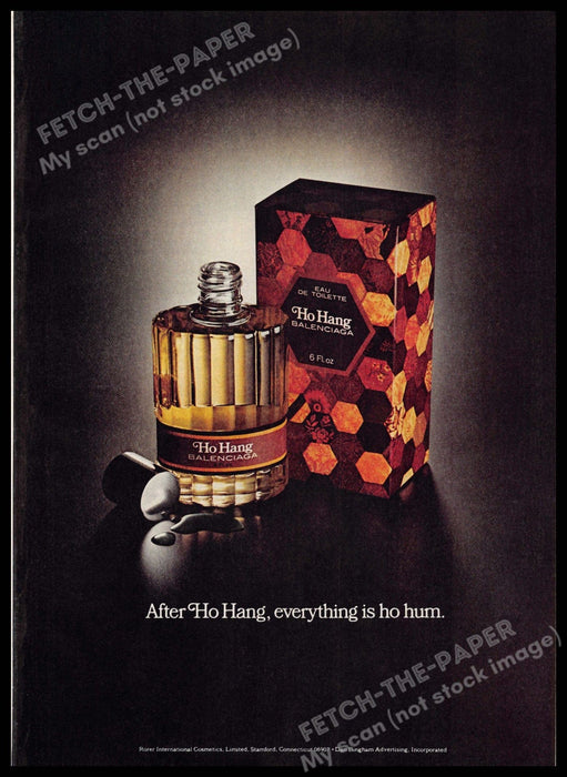 This vintage magazine print advertisement from the 1970s features Balenciaga's Ho Hang fragrance. The ad showcases the elegant bottle and its hexagonal-patterned packaging, emphasizing the luxurious and sophisticated nature of the product. The tagline, "After Ho Hang, everything is ho hum," captures the essence of the fragrance’s impact.