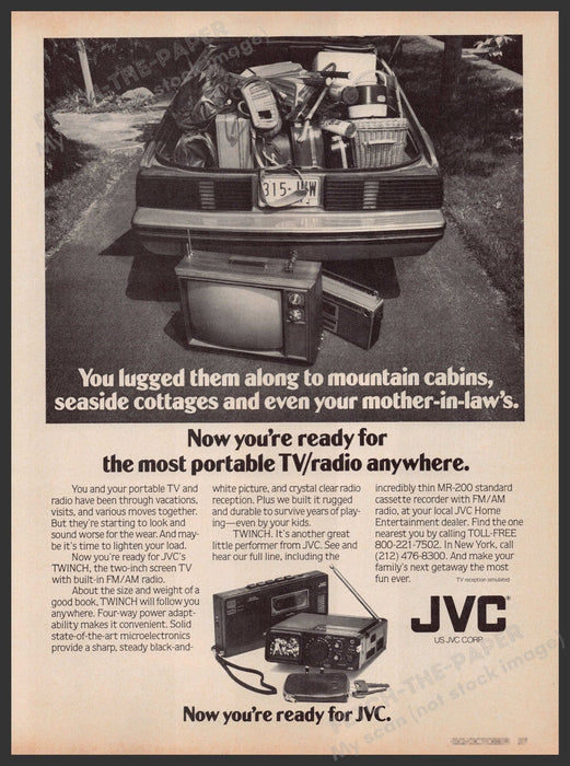 This 1979 magazine ad showcases the JVC Twinch Portable TV/Radio, a must-have gadget of the late 1970s. The ad humorously depicts the struggle of lugging bulky electronics to various locations like mountain cabins and seaside cottages, emphasizing the convenience of the compact Twinch. The product highlights its two-inch screen, FM/AM radio, and robust build, making it perfect for travel and outdoor adventures.