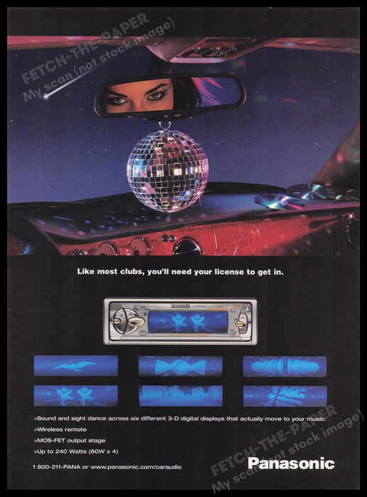 This 2000s print advertisement for the Panasonic CQ-DFX701U Car Radio captures the vibrant and dynamic essence of the early 2000s. The ad features a sleek car interior with a disco ball hanging from the rearview mirror, reflecting the fun and energetic vibe of the era. The tagline, "Like most clubs, you'll need your license to get in," emphasizes the cool and trendy appeal of this car radio, making it a must-have for music lovers who enjoy a lively driving experience.