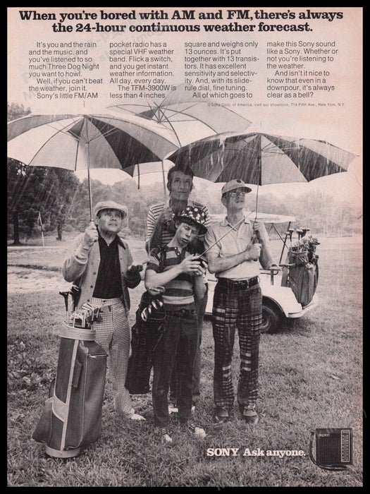 This original 1972 print advertisement for the Sony TFM-3900W Pocket Radio captures the essence of the 1970s with a nostalgic image of golfers braving the rain under large umbrellas. The ad highlights the radio's unique feature of providing a continuous 24-hour weather forecast, making it an essential companion for outdoor enthusiasts.
