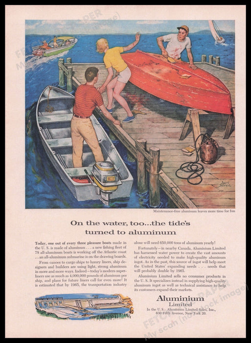 This 1959 Aluminum Ltd. advertisement showcases a vibrant illustration by Amos Sewell, highlighting the use of aluminum in boating. The scene captures a lively moment on a dock, with individuals handling an aluminum boat, emphasizing the material's lightweight and maintenance-free qualities. The ad reflects the innovation and growing popularity of aluminum in the 1950s, promoting its benefits for recreational boating.