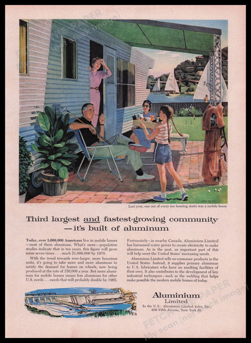This 1950s print advertisement from Aluminum Ltd. showcases a serene family scene by a mobile home, highlighting the growing trend of aluminum-built mobile homes in America. The vibrant illustration captures a family enjoying leisure time, with sailboats in the background, reflecting the lifestyle and aspirations of the era.