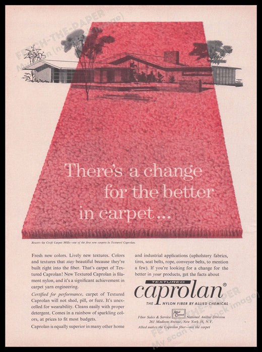 This vintage 1959 advertisement showcases the innovative Caprolan Nylon Fiber by Croft Carpet Mills, highlighting the vibrant and durable qualities of their textured carpets. The ad features a mid-century modern home, emphasizing the era's architectural style and the carpet's ability to enhance such interiors. The bold text, "There's a change for the better in carpet," underscores the product's promise of lasting beauty and performance.