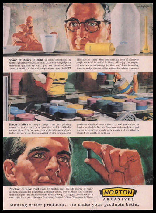 This vintage 1959 Norton Abrasives print advertisement showcases the innovative advancements in ceramic technology and grinding wheels. The ad features a detailed illustration of a scientist examining various ceramic products, highlighting their ability to withstand extreme temperatures and their inert properties. Additionally, it depicts workers in a factory setting, emphasizing the precision and efficiency of Norton's electric kilns in producing high-quality grinding wheels. The bottom section illustrates the potential of nuclear ceramic fuel for modern reactors.