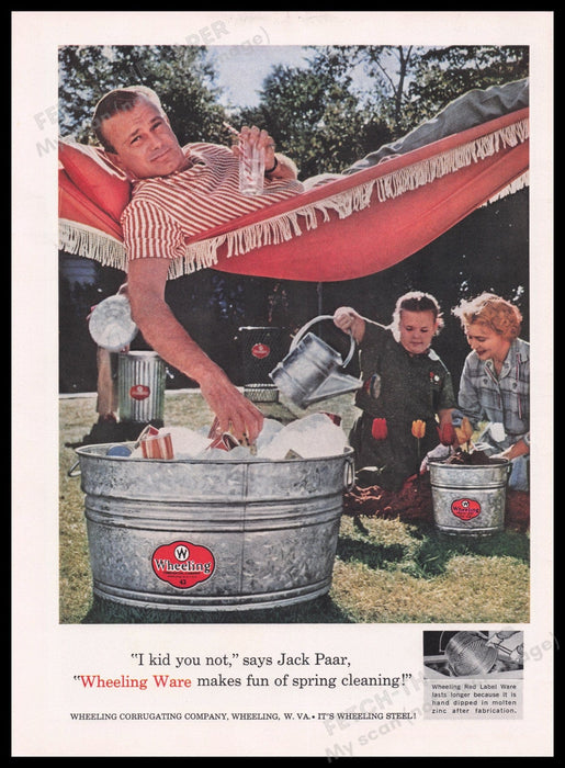 This vintage 1959 advertisement features Jack Paar, a renowned television personality of the 1950s, lounging in a hammock while enjoying a refreshing drink. The scene captures a light-hearted moment as he humorously endorses Wheeling Ware products, making spring cleaning look fun and effortless. The image showcases a family enjoying outdoor activities with Wheeling Steel products prominently displayed, reflecting the era's domestic bliss and practicality.