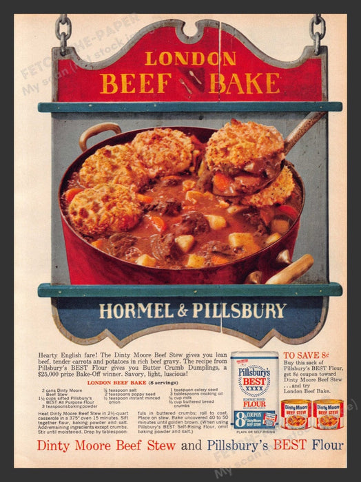 This vintage 1963 advertisement features a delicious recipe for "London Beef Bake" by Hormel & Pillsbury. The ad showcases a hearty English fare made with Dinty Moore Beef Stew, Pillsbury's BEST Flour, and Butter Crumb Dumplings. The vibrant image of the savory beef stew topped with golden dumplings captures the essence of comforting home-cooked meals from the 1960s.