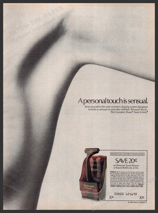 This vintage 1985 Schick print advertisement showcases the "Personal Touch" shaving system, emphasizing its sensual and smooth feel. The ad features a striking image of bare skin, highlighting the product's ability to provide a close and comfortable shave, making your skin look and feel sensuous.