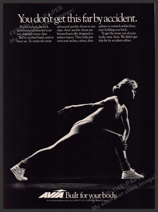This original 1987 Avia print advertisement showcases a dynamic aerobics exerciser in a powerful pose, emphasizing the strength and flexibility of the human body. The ad highlights Avia's commitment to creating advanced aerobic shoes that are biomechanically designed to prevent injuries and enhance performance. The black and white imagery, combined with the sleek design of the footwear, captures the essence of 1980s fitness culture.