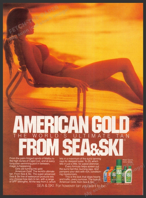 Sea & Ski 1980s Print Advertisement 1987 Sun Tan "American Gold" Legs Beach