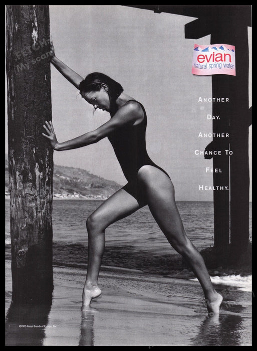 This 1995 Evian Water advertisement captures the essence of athleticism and health. The black-and-white image features an athletic woman in a one-piece swimsuit, stretching her leg against a wooden post by the beach, emphasizing her toned legs and fit body. The ad exudes a sense of vitality and wellness, aligning perfectly with Evian's brand message. The text reads, "Another Day. Another Chance To Feel Healthy."