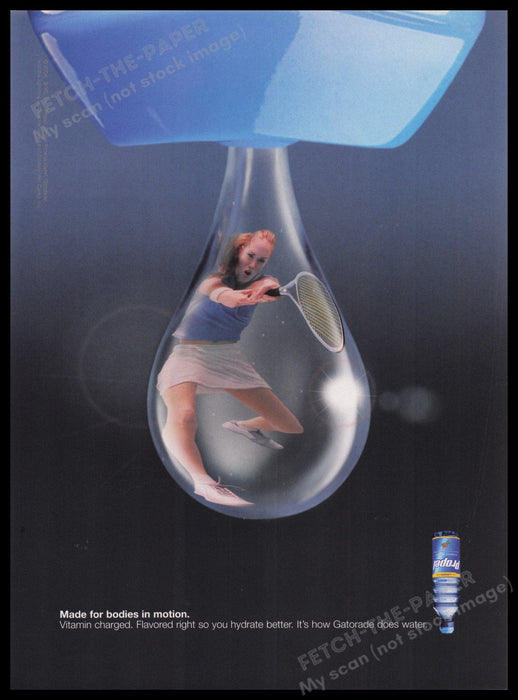 This 2004 print advertisement for Propel Water features a dynamic image of a tennis player captured within a droplet of water, symbolizing hydration and energy. The ad highlights the product's benefits for active individuals, emphasizing its vitamin-charged formula and refreshing flavor that enhances hydration.