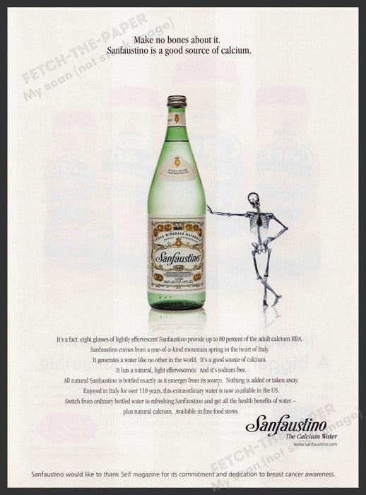 This 2004 Sanfaustino Calcium Water advertisement showcases a bottle of the refreshing drink alongside a playful skeleton, emphasizing the product's calcium benefits. The ad highlights the unique qualities of Sanfaustino water, sourced from a pristine mountain spring in Italy, known for its natural effervescence and high calcium content.