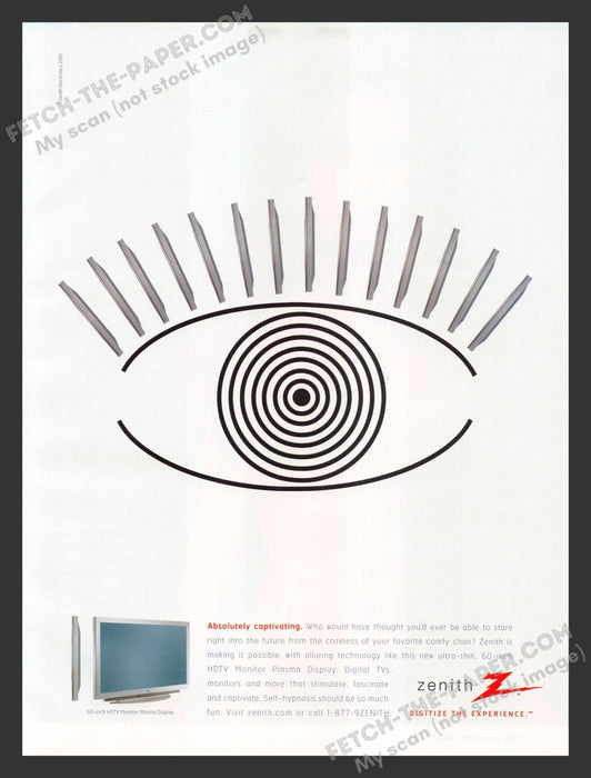 This 2001 magazine print advertisement for the Zenith 60" HDTV Monitor Plasma TV captures the essence of early 2000s technology with a minimalist yet striking design. The ad features an eye-catching graphic of a stylized eye, symbolizing the captivating viewing experience offered by Zenith's cutting-edge plasma display. A small image of the sleek, ultra-thin 60-inch HDTV Monitor Plasma Display is also included, emphasizing the advanced technology and modern aesthetic of the product.