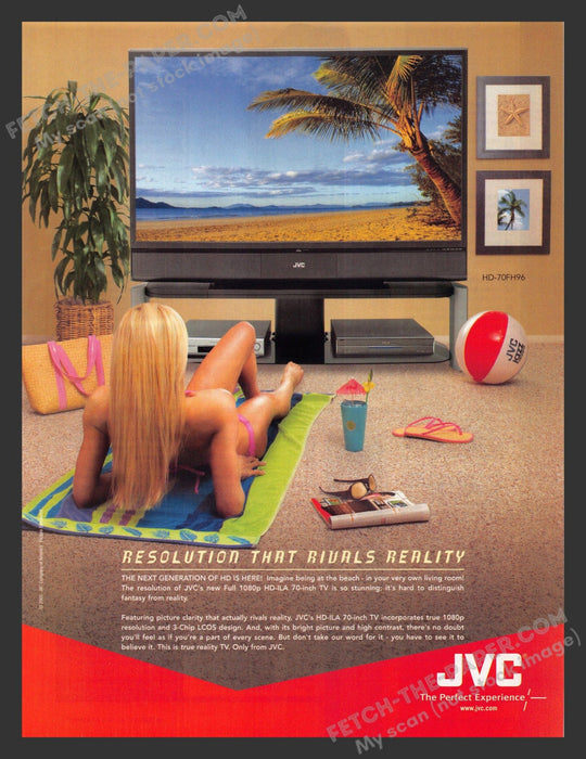 Experience the pinnacle of home entertainment with the JVC HD-70FH96 T.V. This 2000s print ad showcases a stunning visual of a beach scene on the JVC 70-inch TV, emphasizing its remarkable resolution and immersive viewing experience. The ad features a woman lounging on a beach towel, enjoying the vivid display, which highlights the TV's ability to bring realistic imagery into your living room.