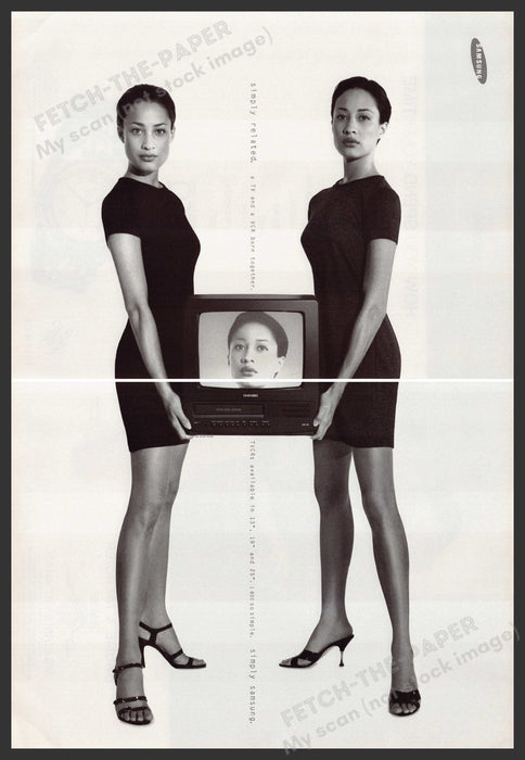 This is a captivating 1995 Samsung TVCRs Combo print advertisement, showcasing the elegance and innovation of the 1990s. The ad features two women dressed in sleek black dresses, standing side by side, each holding a Samsung TVCR combo unit. The image highlights their long, slender legs, appealing to collectors who appreciate such visuals. The minimalist design and monochrome aesthetic emphasize the sophistication and modernity of the era.