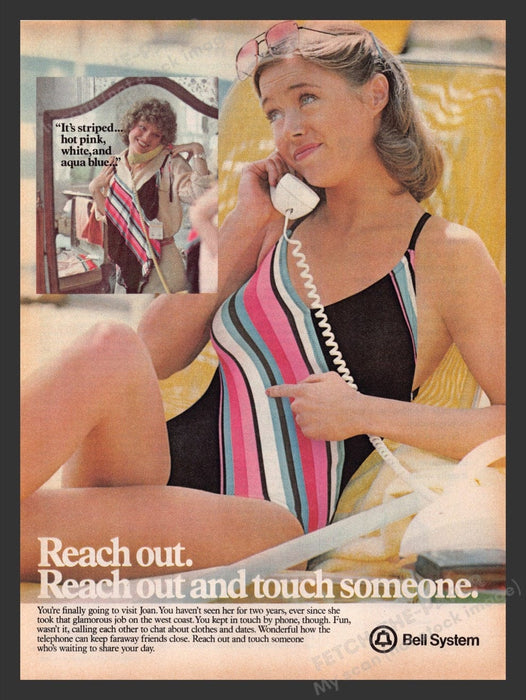 This 1979 Bell Telephone System advertisement captures the essence of staying connected in the late 1970s. The ad features a woman in a colorful striped swimsuit, talking on the phone, emphasizing the importance of keeping in touch with loved ones. The vibrant colors and casual setting showcase the relaxed, yet fashionable style of the era.