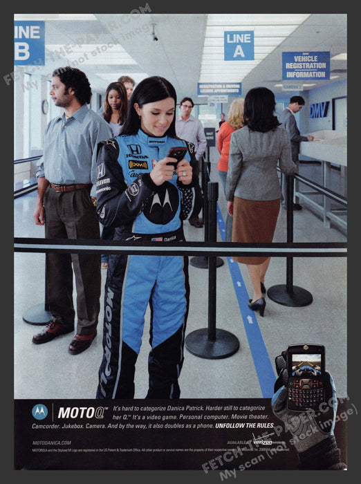 This 2008 Verizon Wireless advertisement features professional race car driver Danica Patrick using a MotoQ cell phone. The ad showcases her in a DMV line, highlighting the versatility and multifunctionality of the MotoQ device.