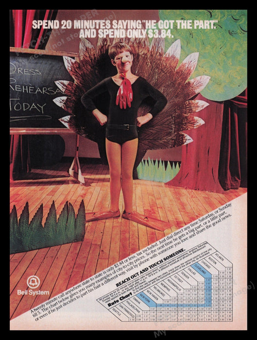 This vintage 1981 Bell System advertisement captures a charming scene from a children's theater rehearsal. A young boy, dressed as a turkey, stands proudly on stage, embodying the theme of "Child's Play." The ad emphasizes the affordability and convenience of making long-distance calls to share joyous moments, such as a child's successful audition, for just $3.84.