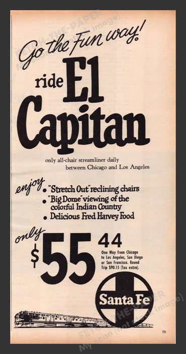 El Capitan Santa Fe Train Chicago to L.A. 1950s Print Advertisement Ad 1956
