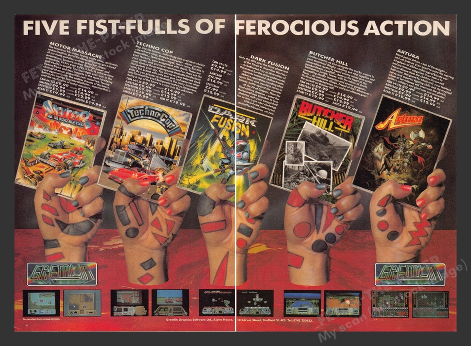 Step back into the thrilling 1980s with this exclusive 1988 U.K. print ad for "Five Fist-Fulls of Action" by Gremlin Graphics Software. This vibrant two-page spread showcases a lineup of five adrenaline-pumping video games: Motor Massacre, Techno Cop, Dark Fusion, Butcher Hill, and Artura. The dynamic imagery features hands gripping the game covers, emphasizing the fierce action and excitement each game promises. Carefully removed from a magazine, this collectible piece measures approximately 8" x 11.5" per page, making it a perfect addition to any retro gaming collection.