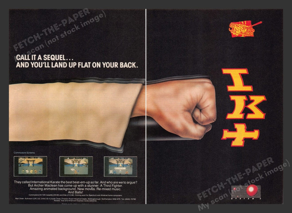 This is a 1988 U.K. exclusive print advertisement for the video game "IK+ International Karate Plus." The ad features a powerful visual of a karate fighter's arm and fist, emphasizing the game's action-packed nature. The tagline, "Call it a sequel... And you'll land up flat on your back," highlights the game's competitive edge. The two-page spread showcases the game's stunning graphics and new features, making it an enticing piece for collectors and fans of retro gaming.