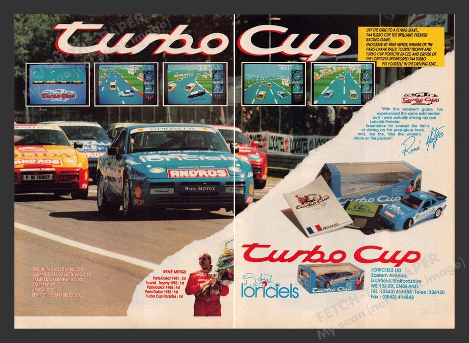 Experience the thrill of high-speed racing with this 1988 U.K. Exclusive Turbo Cup video game print advertisement. This vibrant two-page spread showcases the excitement of Turbo Cup, a premier racing game endorsed by René Metge, a celebrated racing champion. The ad features dynamic in-game screenshots and real-life racing imagery, capturing the essence of the late 1980s gaming and racing culture.