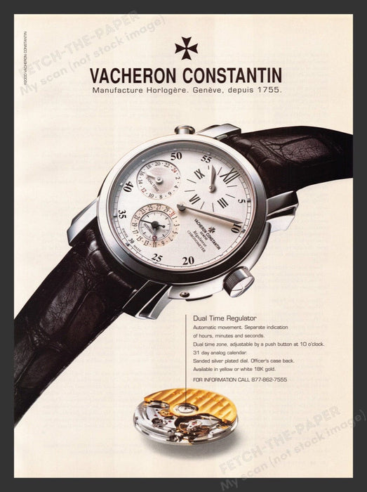 This is an original 2000 print advertisement for the Vacheron Constantin Chronometer Watch, showcasing the brand's exquisite craftsmanship and timeless design. The ad features a detailed image of the Dual Time Regulator model, highlighting its sophisticated dial and luxurious leather strap. The background emphasizes the watch's elegance and the heritage of Vacheron Constantin, established in Geneva since 1755.