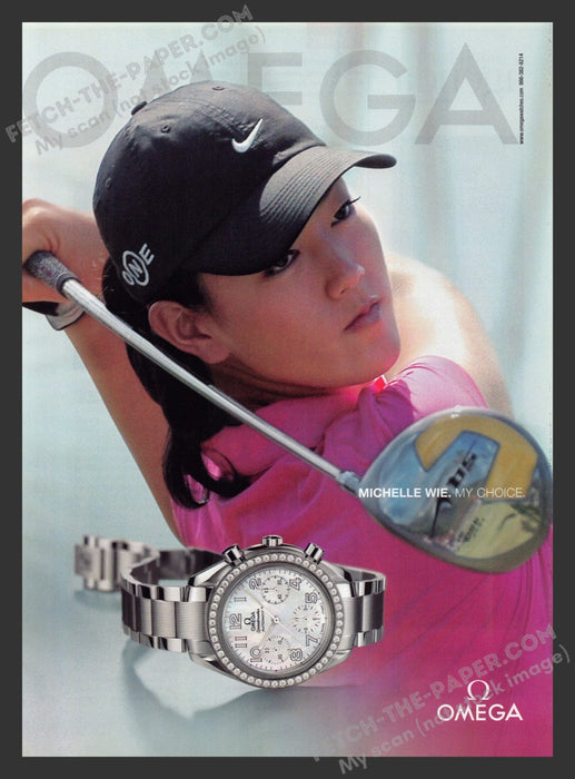 This 2007 Omega Watch print ad features professional golfer Michelle Wie in action, showcasing her choice of timepiece. The ad captures the elegance and precision of Omega Watches, perfectly aligning with the athletic prowess of Michelle Wie.