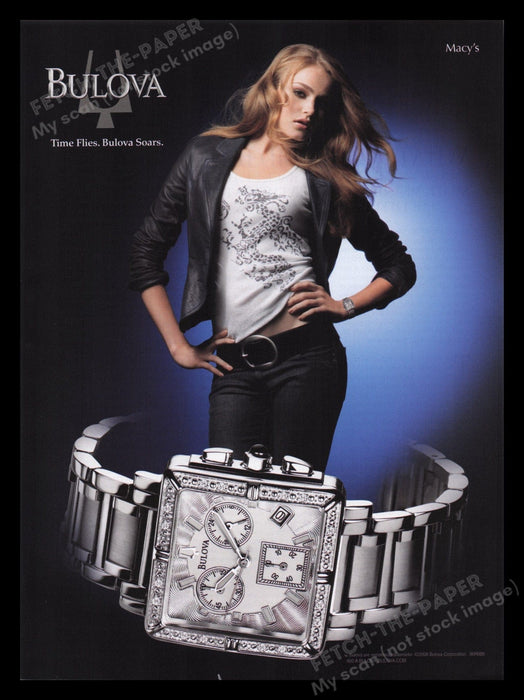 This captivating Bulova Watch print advertisement from the 2000s showcases a stylish and elegant model wearing a chic leather jacket and a fashionable watch. The ad emphasizes the sophistication and timeless appeal of Bulova watches, with the tagline "Time Flies. Bulova Soars." The image highlights the intricate design and luxurious feel of the watch, making it a must-have accessory for fashion enthusiasts.