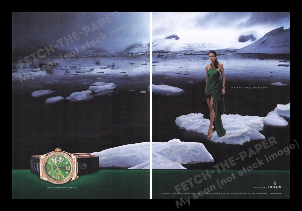 This is a stunning 2007 Rolex Watch print advertisement showcasing the epitome of fearless luxury. The two-page spread features a captivating scene with a woman elegantly dressed in a green gown, standing confidently on an iceberg amidst a serene, icy landscape. The Rolex Oyster Perpetual Datejust watch is prominently displayed, emphasizing its timeless elegance and precision.