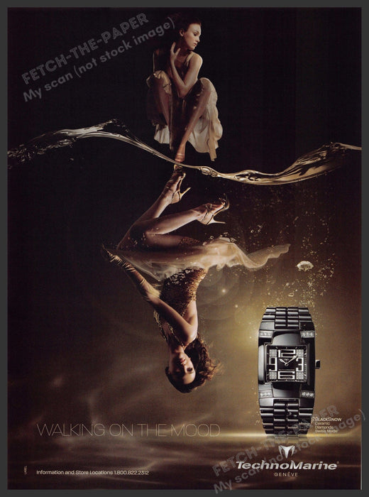 This captivating 2008 TechnoMarine advertisement showcases a mesmerizing scene featuring a woman elegantly poised above water, her reflection beneath her creating a surreal, dreamlike effect. The focus is on her legs, beautifully highlighted by the shimmering water and the delicate fabric of her dress. The ad exudes sophistication and luxury, perfectly complementing the sleek design of the TechnoMarine Black Snow watch displayed prominently.