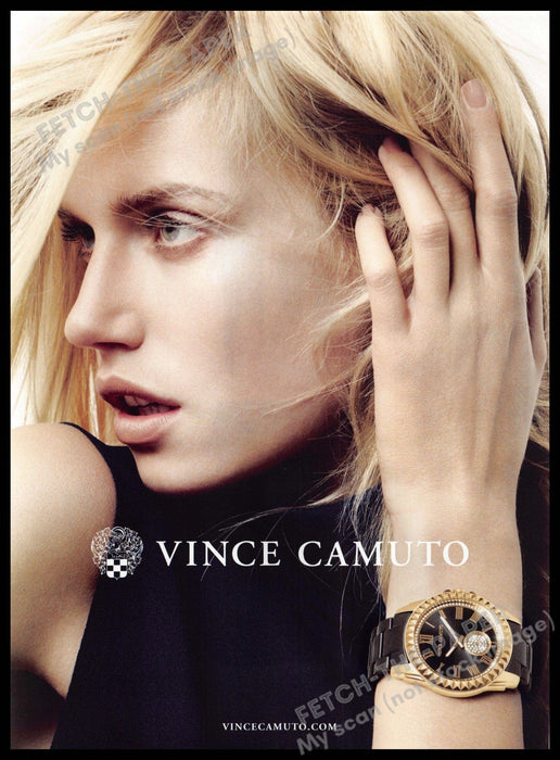 This stunning 2014 Vince Camuto magazine print ad features a captivating close-up of a sexy blonde model showcasing a luxurious watch. The model's intense gaze and the elegant design of the watch highlight the sophistication and allure of Vince Camuto's brand.