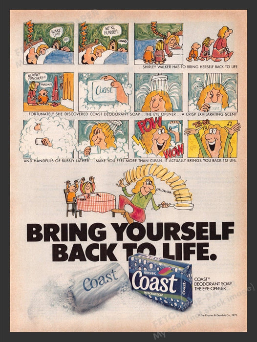 This vibrant 1970s print ad for Coast Deodorant Soap showcases a humorous comic strip featuring Shirley Walker, who needs to bring herself back to life. The ad illustrates her morning routine with Coast Deodorant Soap, highlighting its crisp, exhilarating scent and bubbly lather that revitalize her day. The tagline "Bring yourself back to life" emphasizes the refreshing and invigorating qualities of the soap.