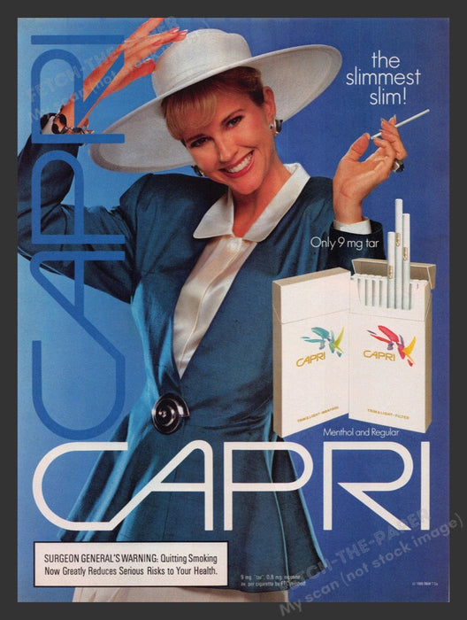 Capri Slim Cigarettes Blue 1980s Print Advertisement Ad 1989